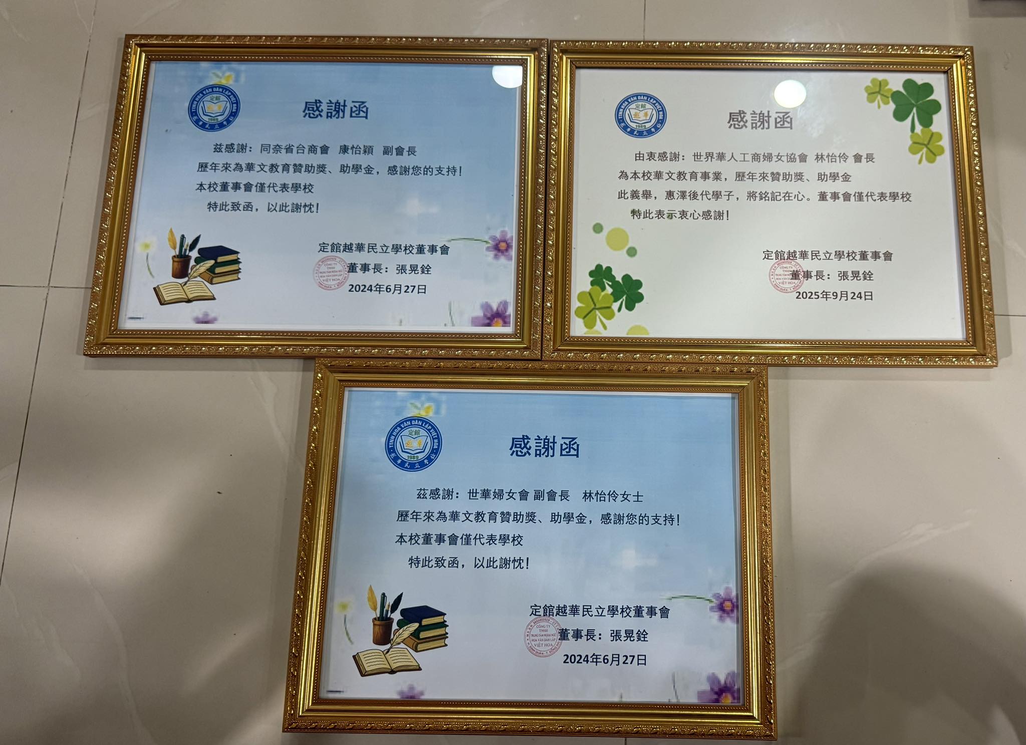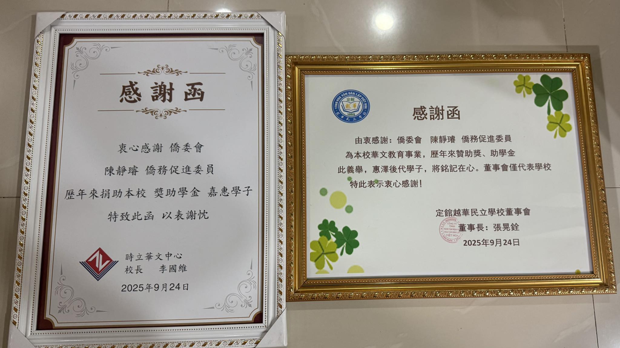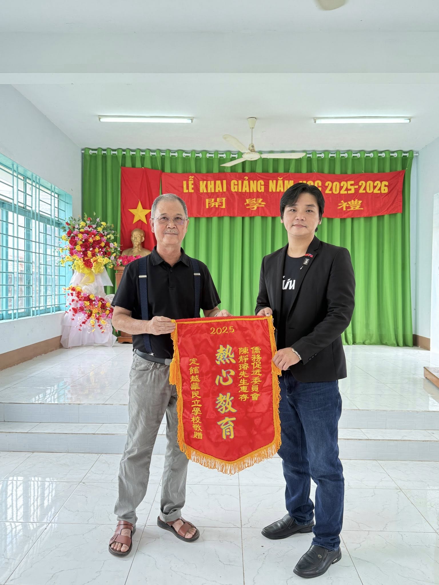 越華民立學校董事長 #張晃銓 及時立華文學校校長 #李國維 代表受贈,感動表示這份愛心為學生點燃學習熱情,培育未來棟樑!