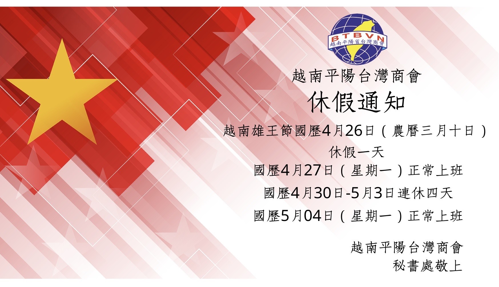 ​ 【越南平陽台灣商會|#放假公告】 ​
