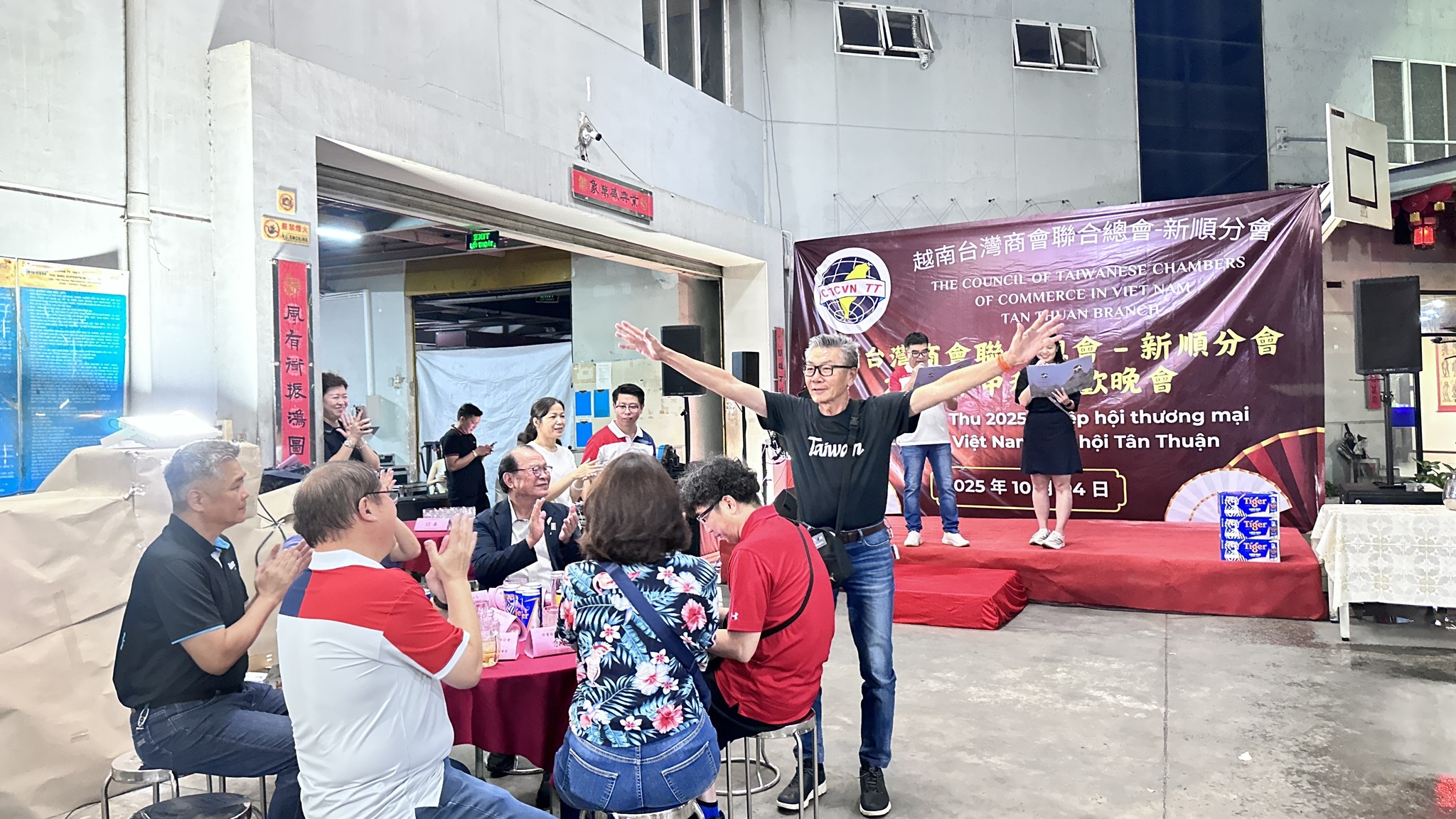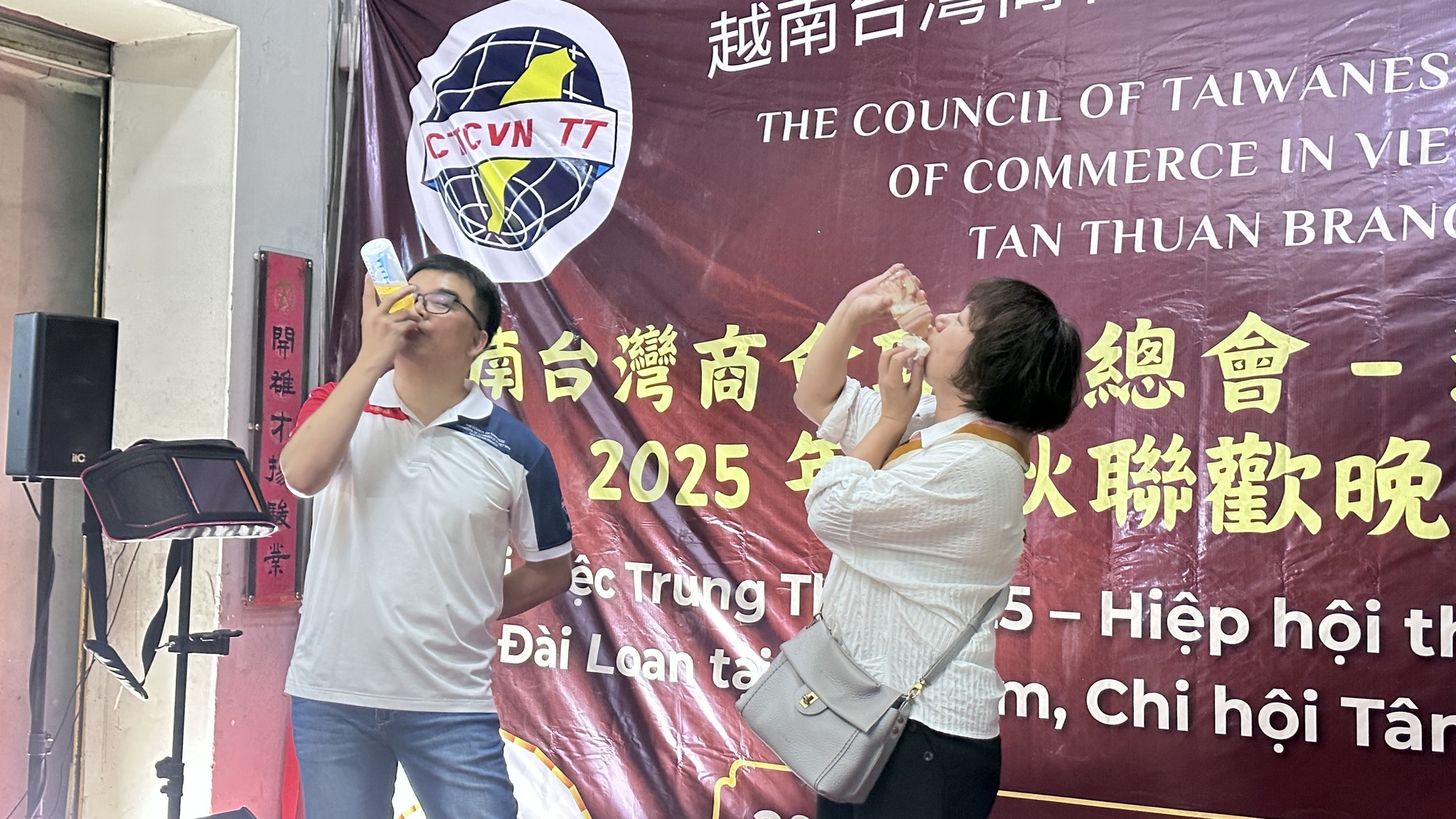 活動亮點:劉會長分享昨晚向媽祖娘娘祈求「只下毛毛雨」,果然晚會順利開場,象徵福氣臨門、平安順利!隨後舉辦「奶瓶喝啤酒比賽」,就像將媽祖賜福喝下肚,另外參賽者太有梗,超誇張表情讓全場笑翻;卡拉OK環節更是嗨到爆,台商朋友們放聲高歌,氣氛火熱!