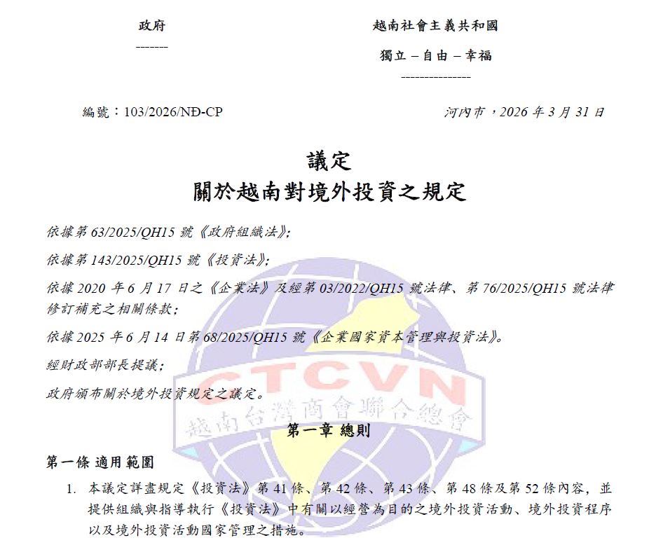 越南政府於2026年03月31日頒布了第103/2026/NĐ-CP號議定,該議定詳盡規範越南對境外投資之程序與國家管理,明定財政部為核心主管機關,並將專案劃分為「總理核准」、「財政部核發」及「免辦證僅需外匯登記」三類以優化審核。 條文嚴格規範30萬美元前期資金匯出限額、12個月內利潤匯回時限及電子申報義務,並建立違規資訊公開與自動註銷機制,旨在健全資本流出監管並保護投資者海外權益。